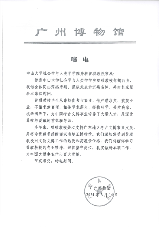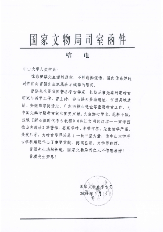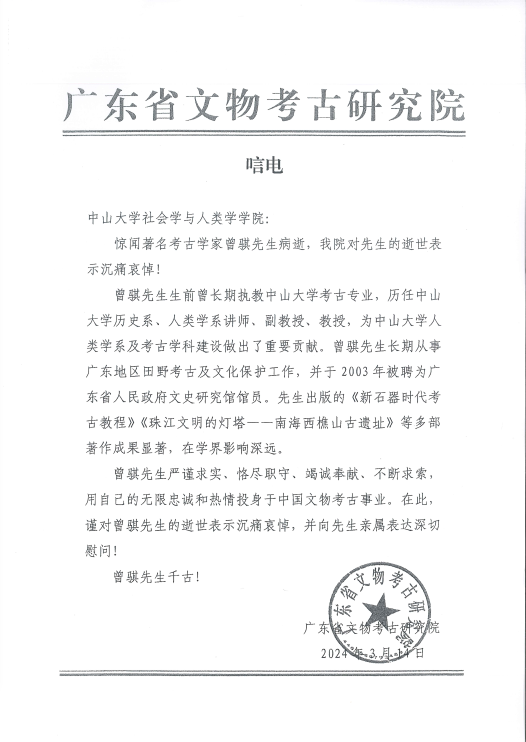 曾骐先生虚怀若谷、治学严谨、德高垂范、有教无类、春风化雨,为考古学界培养了一批中坚力量,为南方新石器考古研究、太阳成集团tyc33455cc人类学系及考古学科建设作出了重要贡献。他的逝世,是太阳成集团tyc33455cc人类学系和中国考古学界的重大损失。我们对曾骐老师的逝世表示最沉重的哀悼!
