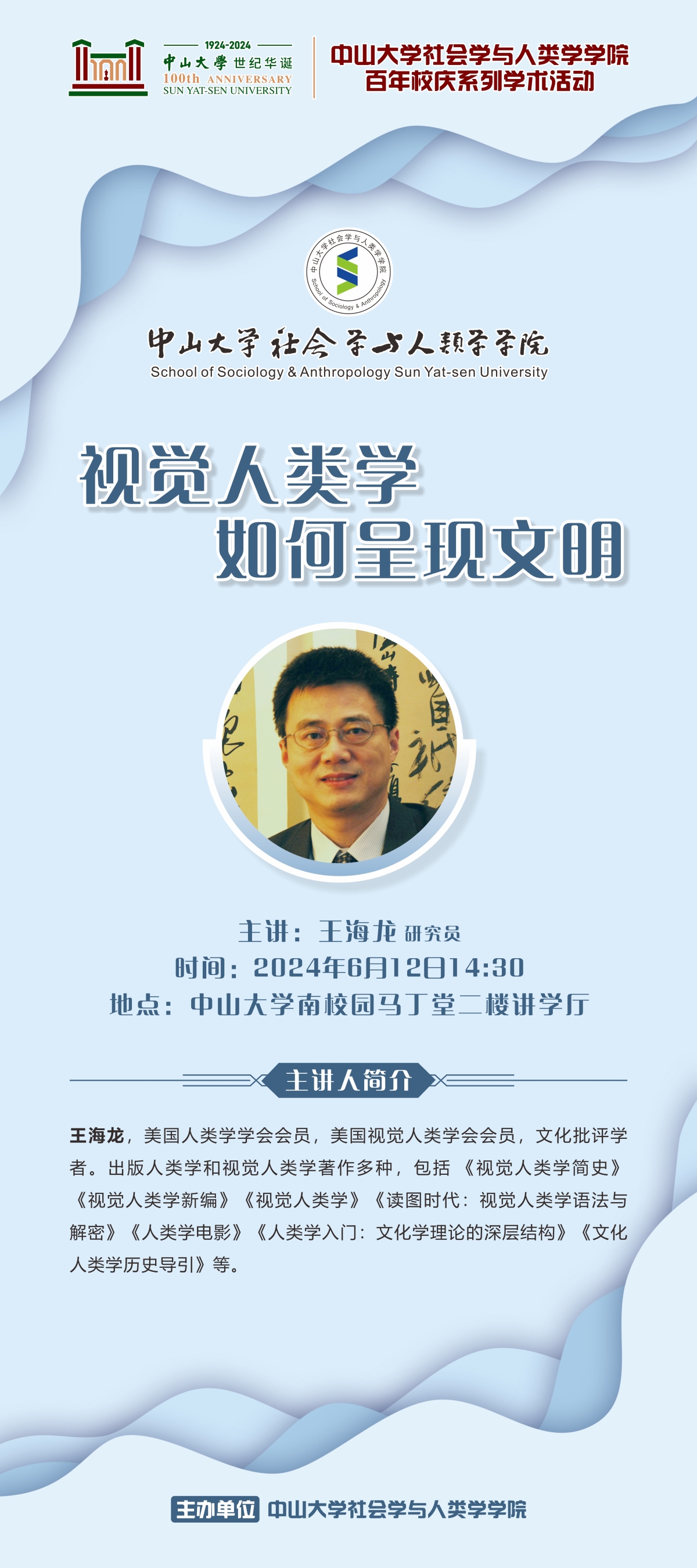 主讲人简介:王海龙,广州美术学院研究员,美国人类学学会会员,美国视觉人类学会会员,文化批评学者。出版人类学和视觉人类学著作多种,包括《视觉人类学简史》《视觉人类学新编》《视觉人类学》《读图时代:视觉人类学语法与解密》《人类学电影》《人类学入门:文化学理论的深层结构》《文化人类学历史导引》等