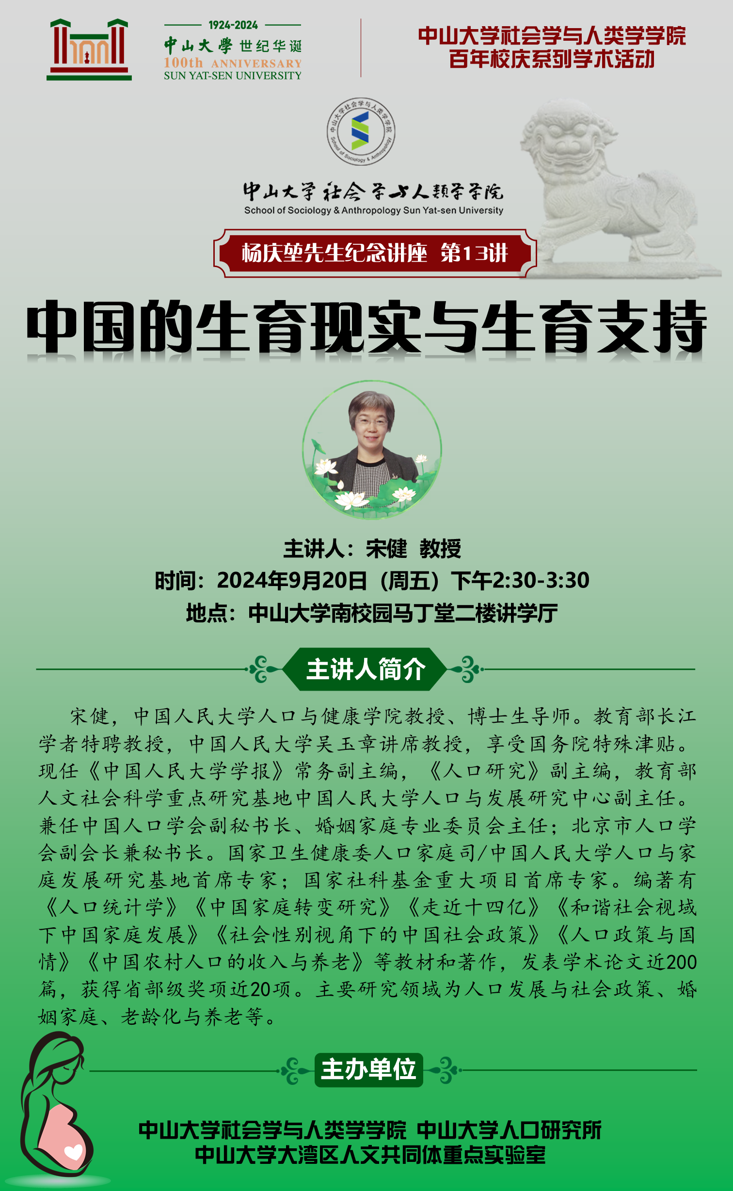 主讲人简介:宋健,中国人民大学人口与健康学院教授、博士生导师。教育部高层次人次特聘教授,中国人民大学吴玉章讲席教授,享受国务院特殊津贴。现任《中国人民大学学报》常务副主编,《人口研究》副主编,教育部人文社会科学重点研究基地中国人民大学人口与发展研究中心副主任。兼任中国人口学会副秘书长、婚姻家庭专业委员会主任;北京市人口学会副会长兼秘书长。国家卫生健康委人口家庭司/中国人民大学人口与家庭发展研究基地首席专家;国家社科基金重大项目首席专家。编著有《人口统计学》《中国家庭转变研究》《走近十四亿》《和谐社会视域下中国家庭发展》《社会性别视角下的中国社会政策》《人口政策与国情》《中国农村人口的收入与养老》等教材和著作,发表学术论文近 200 篇,获得省部级奖项近 20 项。主要研究领域为人口发展与社会政策、婚姻家庭、老龄化与养老等。