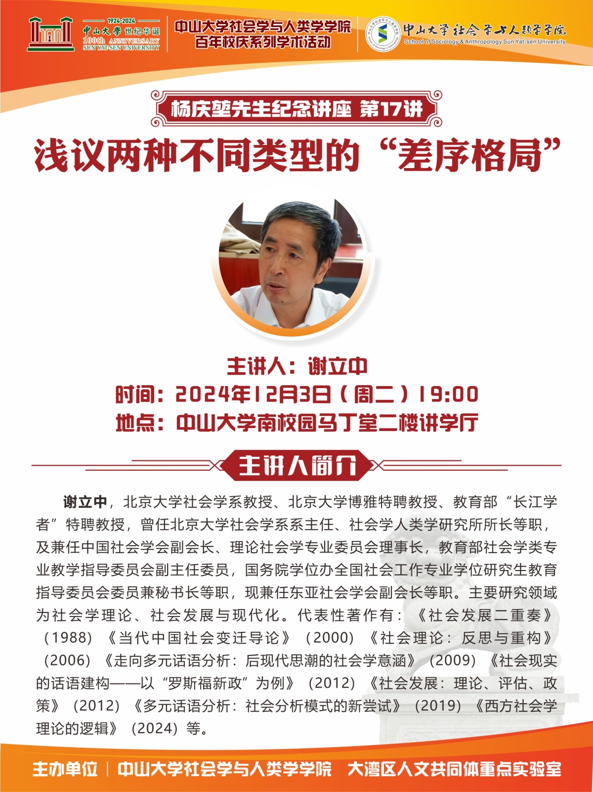 主讲人简介:谢立中,北京大学社会学系教授、北京大学博雅特聘教授、国家重大人才工程特聘教授,曾任北京大学社会学系系主任、社会学人类学研究所所长等职,及兼任中国社会学会副会长、理论社会学专业委员会理事长,教育部社会学类专业教学指导委员会副主任委员,国务院学位办全国社会工作专业学位研究生教育指导委员会委员兼秘书长等职,现兼任东亚社会学会副会长等职。主要研究领域为社会学理论、社会发展与现代化。代表性著作有:《社会发展二重奏》(1988)《当代中国社会变迁导论》(2000)《社会理论:反思与重构》(2006)《走向多元话语分析:后现代思潮的社会学意涵》(2009)《社会现实的话语建构——以“罗斯福新政”为例》(2012)《社会发展:理论、评估、政策》(2012)《多元话语分析:社会分析模式的新尝试》(2019)《西方社会学理论的逻辑》(2024)等。