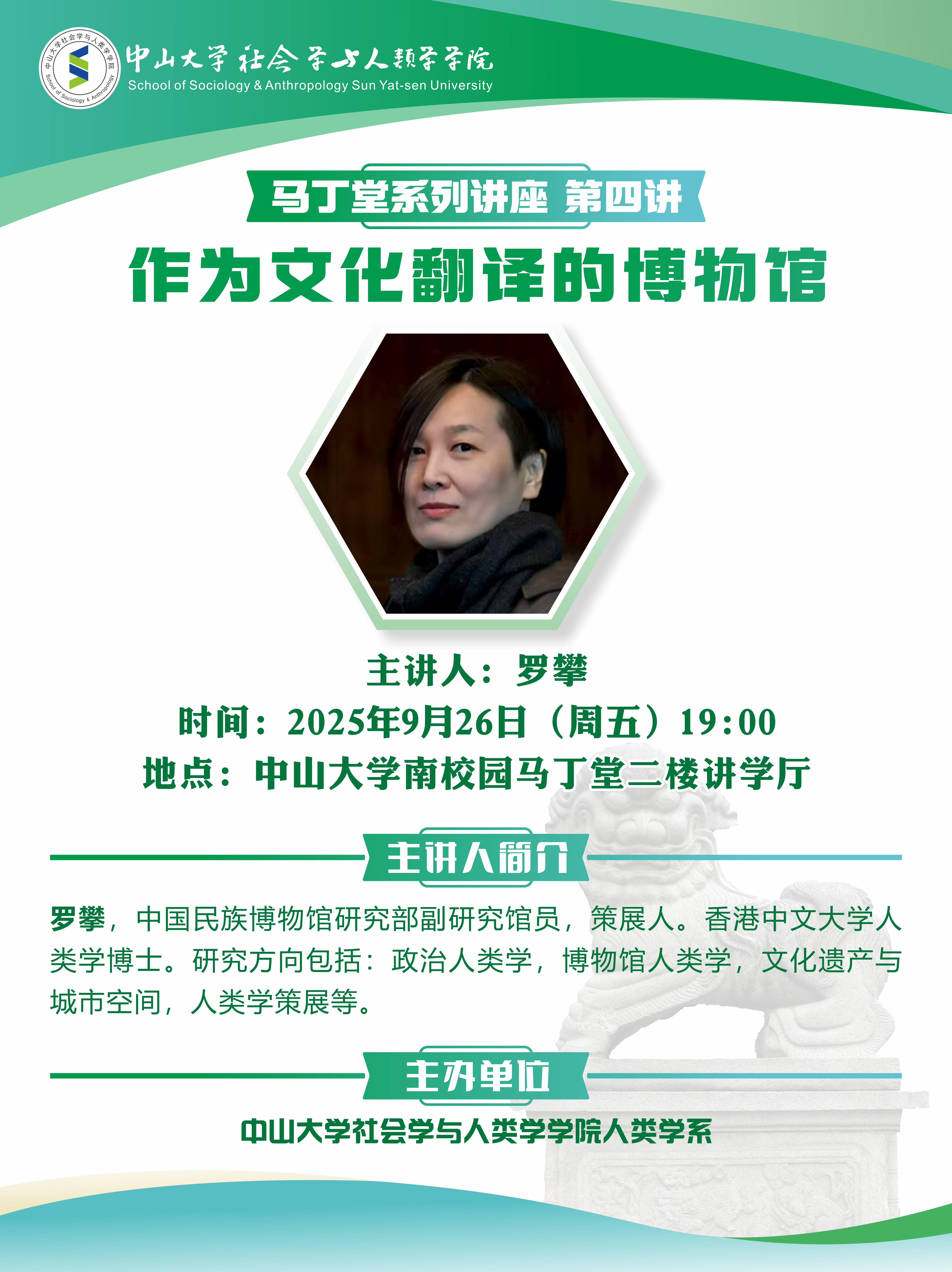 本讲座将结合民族志写作与展览的比较,探讨博物馆翻译如何在跨文化理解中发挥作用,并借助“接触地带”理论与新博物馆学的实践,剖析博物馆如何在历史与社会关系中建构意义。同时还将讨论如何引入多元声音,让展览成为一个对话空间,从而以更公平、负责任的方式讲述文化。